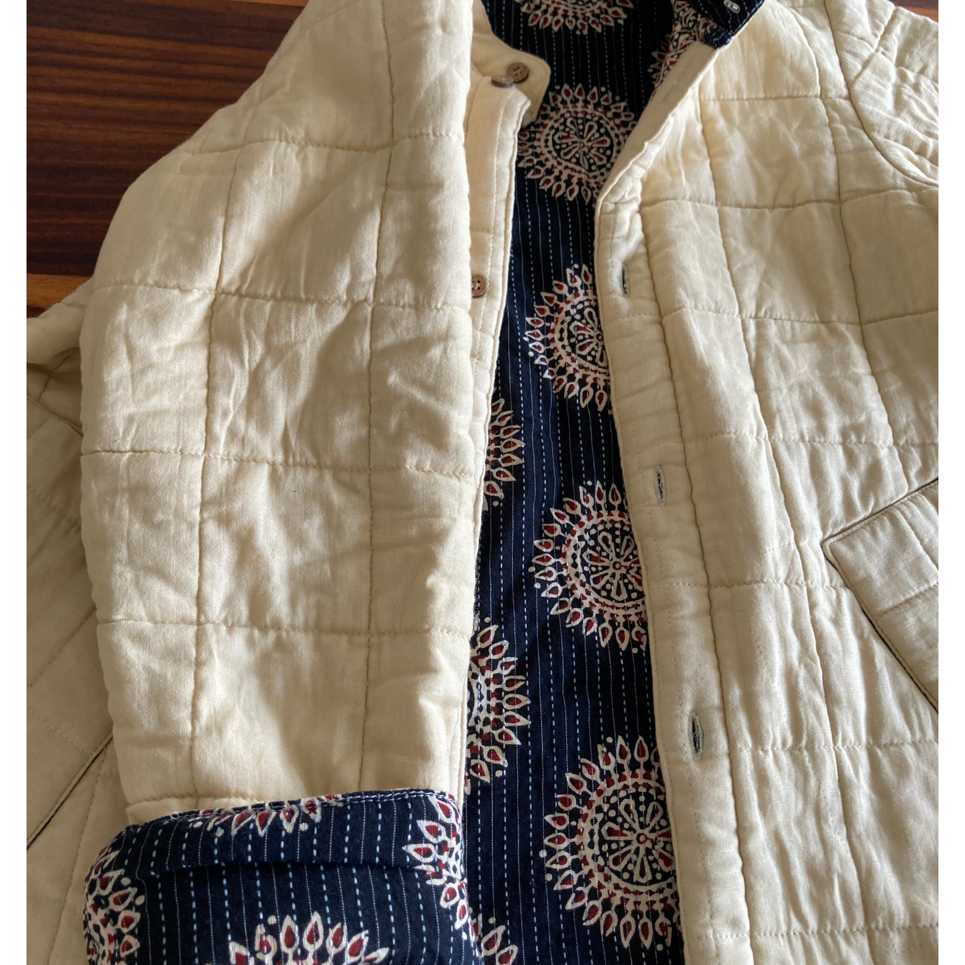 Expertly crafted from premium 100% quilted cotton, this double-sided jacket offers versatile styling for every occasion. Available in children's sizes 1Y–10Y and adult sizes XS–XXL, each piece is handmade with meticulous attention to detail. The lining fabric will be assorted in the same aesthetics, i.e., blockprinted in similar colors.